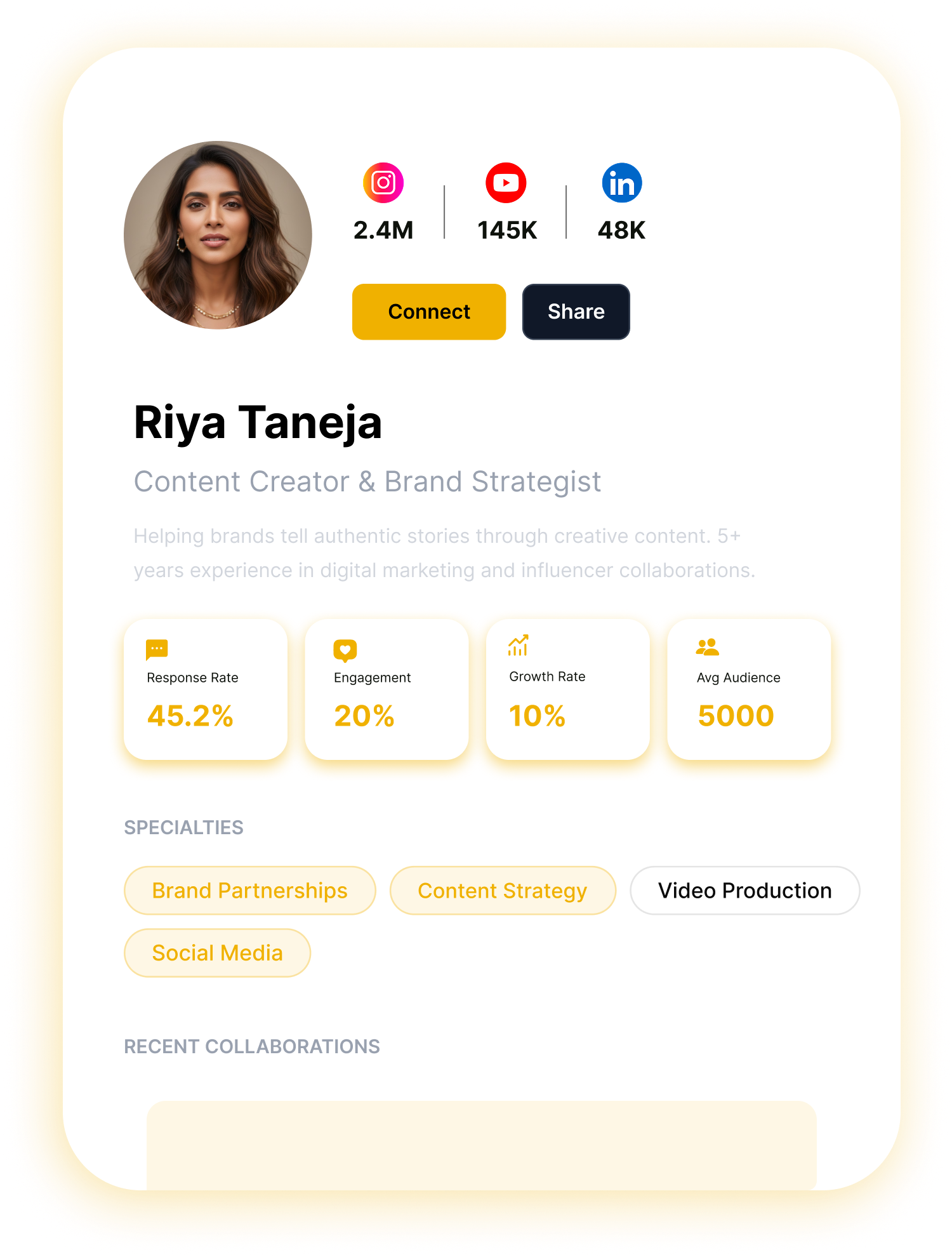 Browse through thousands of verified creators, mentors, and brands. Our smart filters and AI-powered recommendations help you discover exactly who you're looking for based on niche, location, experience, and goals.